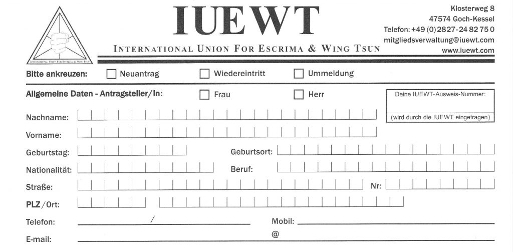 Hinweis: mit Vertragsabschluß wird gleichzeitig eine Mitgliedschaft in der IUEWT (International Union For Escrima & WingTsun) beantragt. Diese Mitgliedschaft ist Vorraussetzung für zukünftige Teilnahme an Prüfungslehrgängen und den Erhalt von Leistungszertifikaten. Prüfungslehrgänge für Graduierungen werden durch die IUEWT durchgeführt und sind nicht Bestandteil des Mitgliedvertrages mit der Schule. Die Lehrgangsgebühr wird am Termin vor Ort entrichtet.